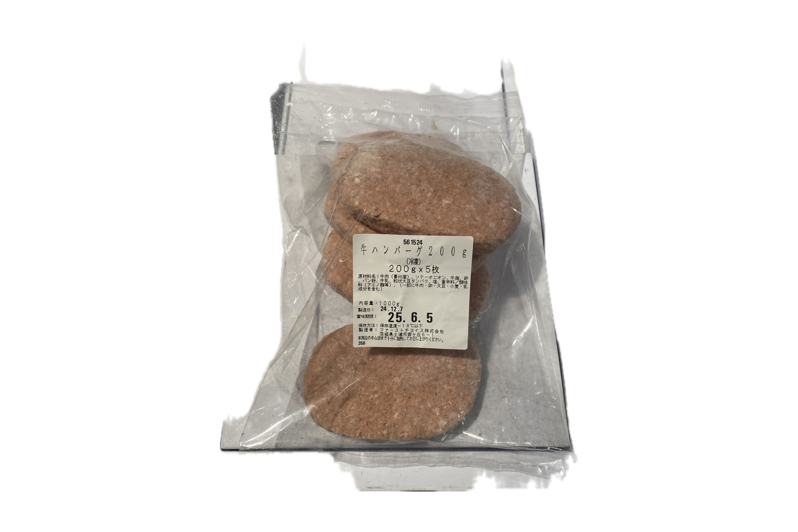 原材料 | 牛肉 (豪州産)、 ソテーオニオン、 牛脂、卵、パン粉、 牛乳、 粒状大豆タンパク、塩、香辛料/調味料(アミノ酸等)、(一部に牛肉・卵・大豆・小麦・乳 成分を含む) |