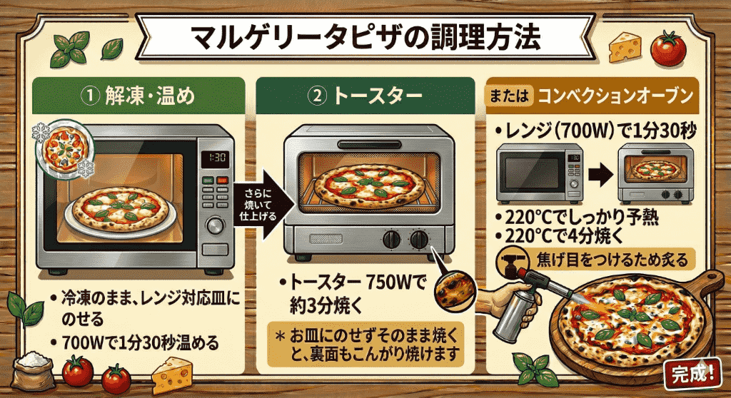 | 調理方法 | 【調理工程】 レンジ解凍 → 焼成 【提供目安時間】 約5分 【提供時調理】 ①冷凍のまま、ピザをお皿にのせて電子レンジ(700W)で約1分30秒加熱する。 ②トースター(750W)で約3分焼く。 または ①電子レンジ(700W)で約1分30秒加熱する。 ②コンベクションオーブン(220℃)で約4分焼く。 無げ目をつけるように焼いて提供。 |