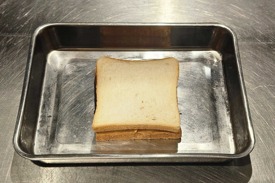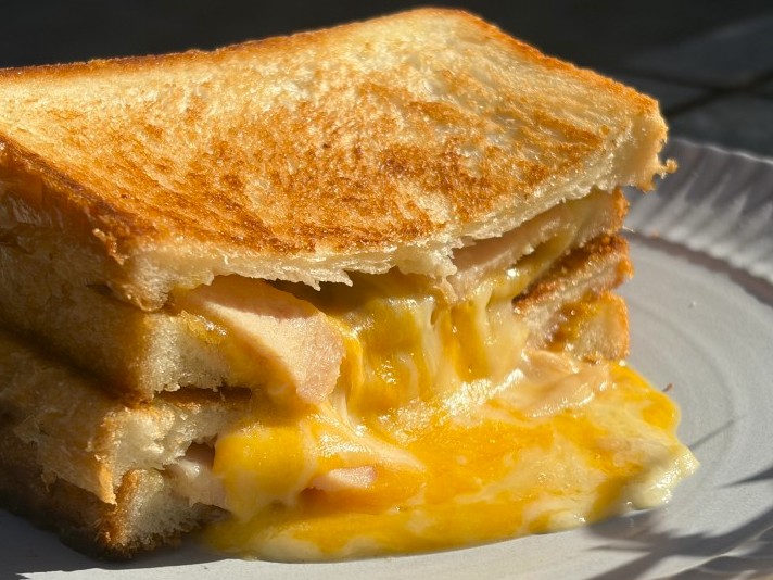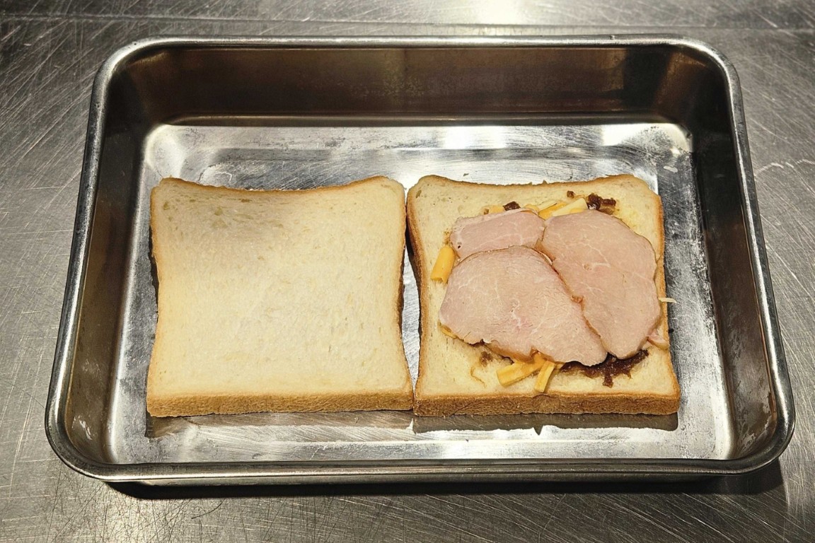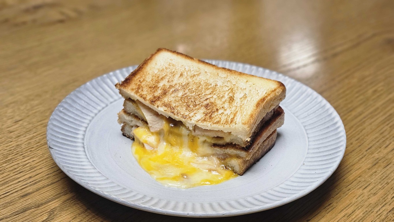 パンにスモークチキンとナチュラルチーズ、ソテーオニオンを挟んだサンドイッチ。